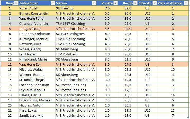 In der U8 kam Lukas zu seinem Debüt. Außerdem spielten Victoria und Wafaa mit. Sieger wurde Elias Zhu vom TSV Solln vor Oscar Chenhao Zhong vom SC Vaterstetten-Grasbrunn und Sian Kalva vom SK Herzogenaurach. Bestes Mädchen war: Alica Lachenmaier vom SC Garching.